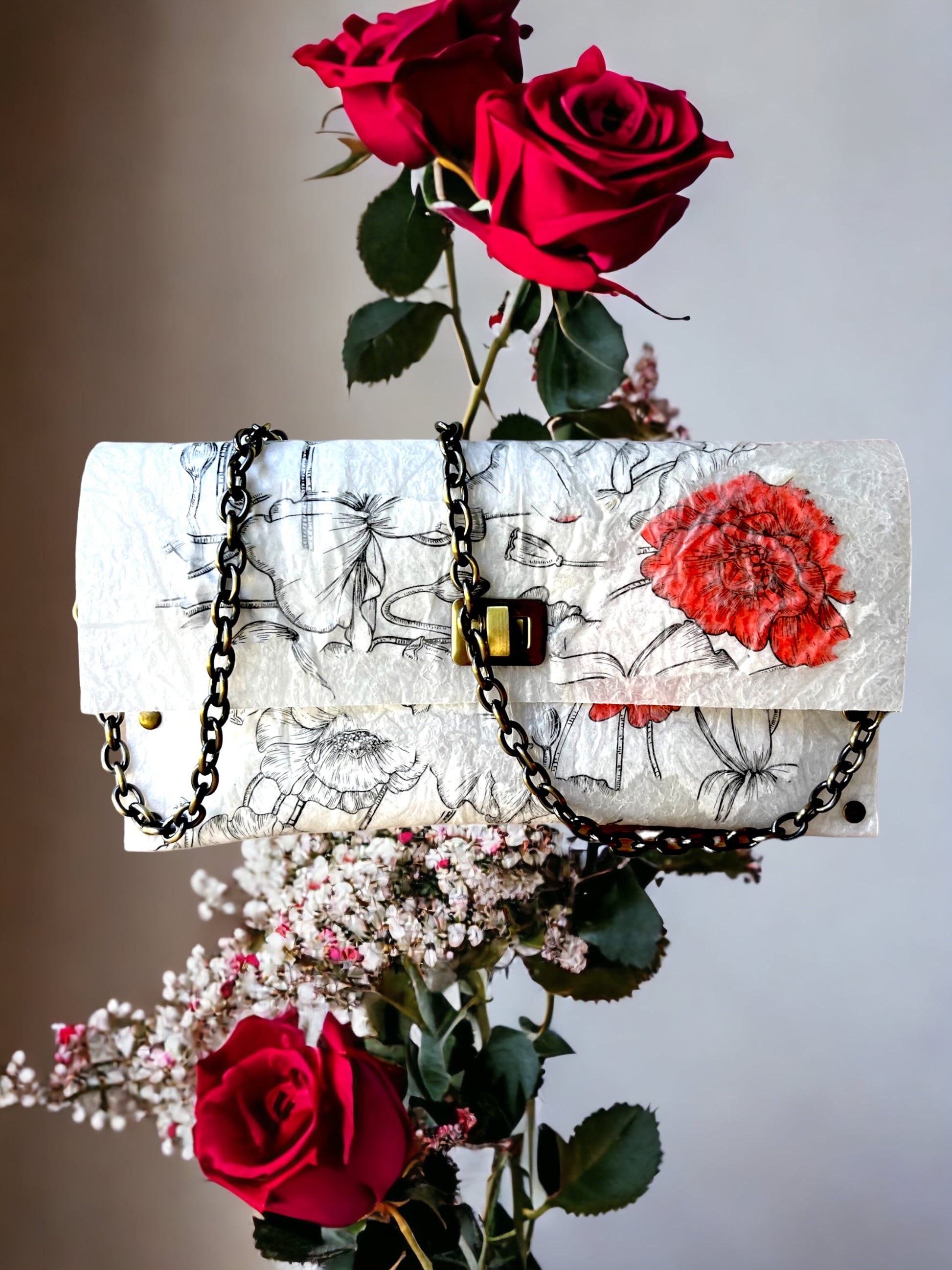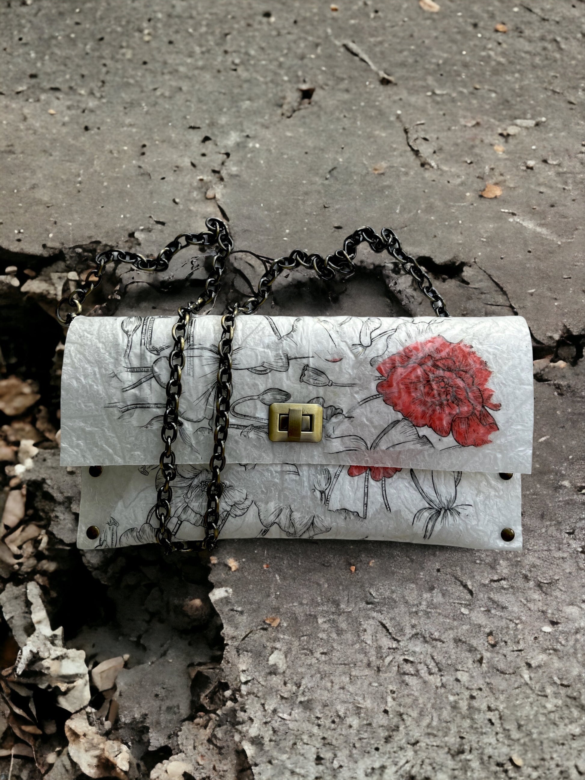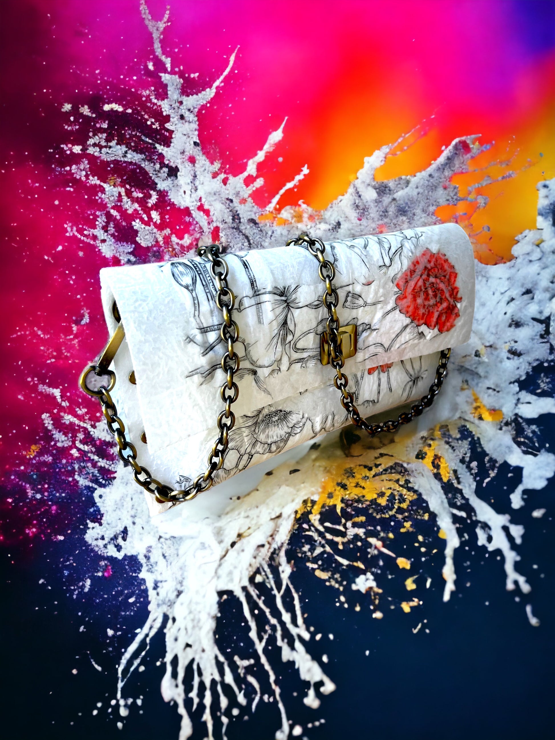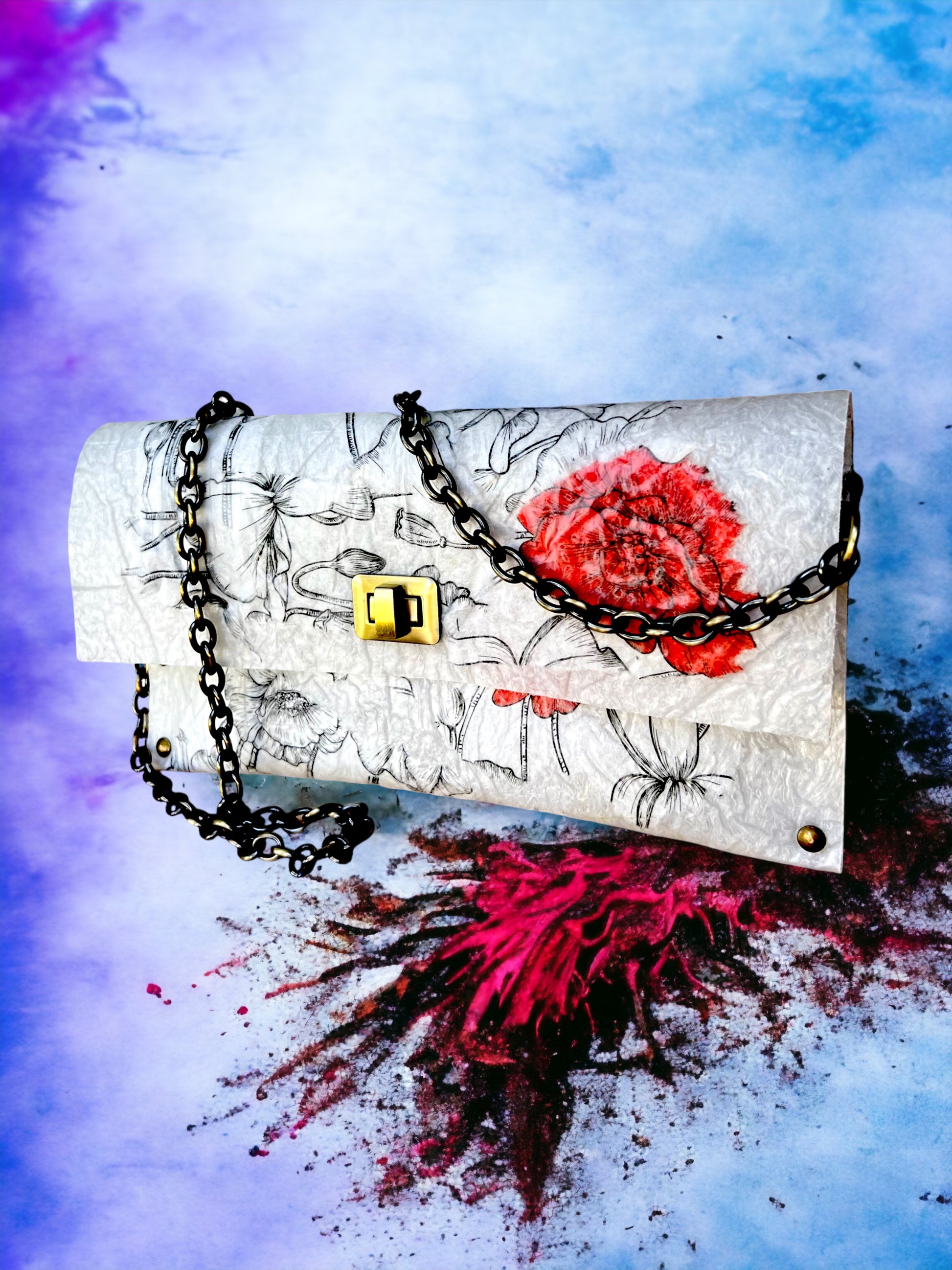 This eye-catching abstract floral design purse features a beautiful decoupage rose set off against a stark white background for a bold, modern look. The amazing design of this purse ensures that no two will ever be the same, making a stylish statement wherever you go.