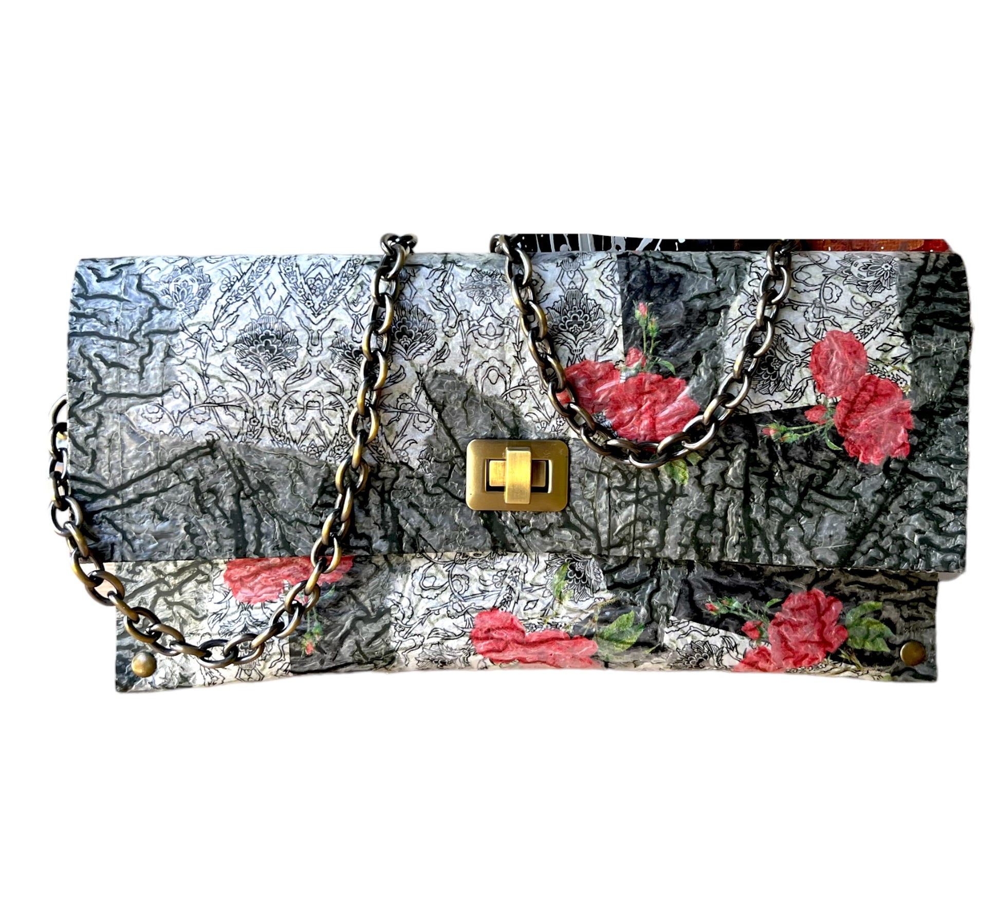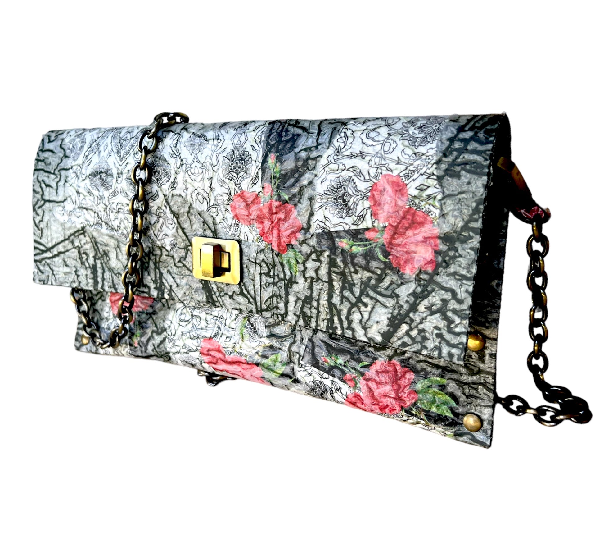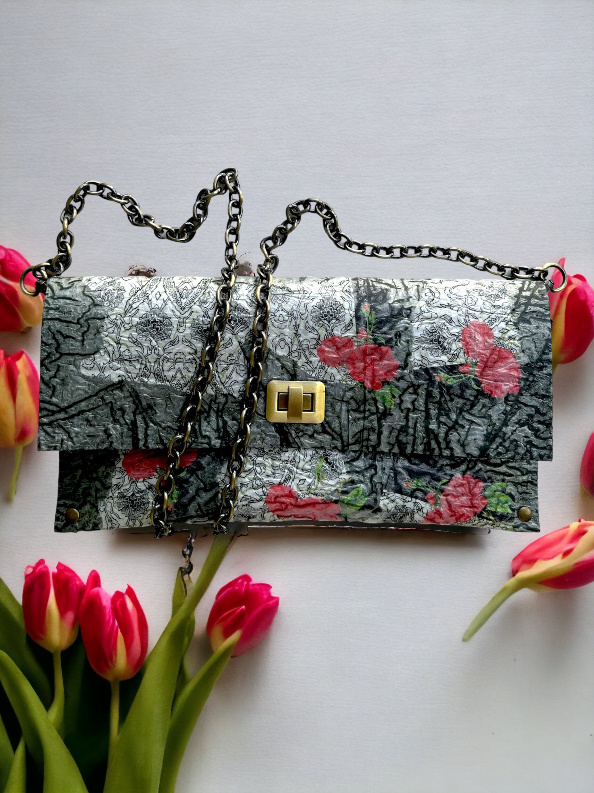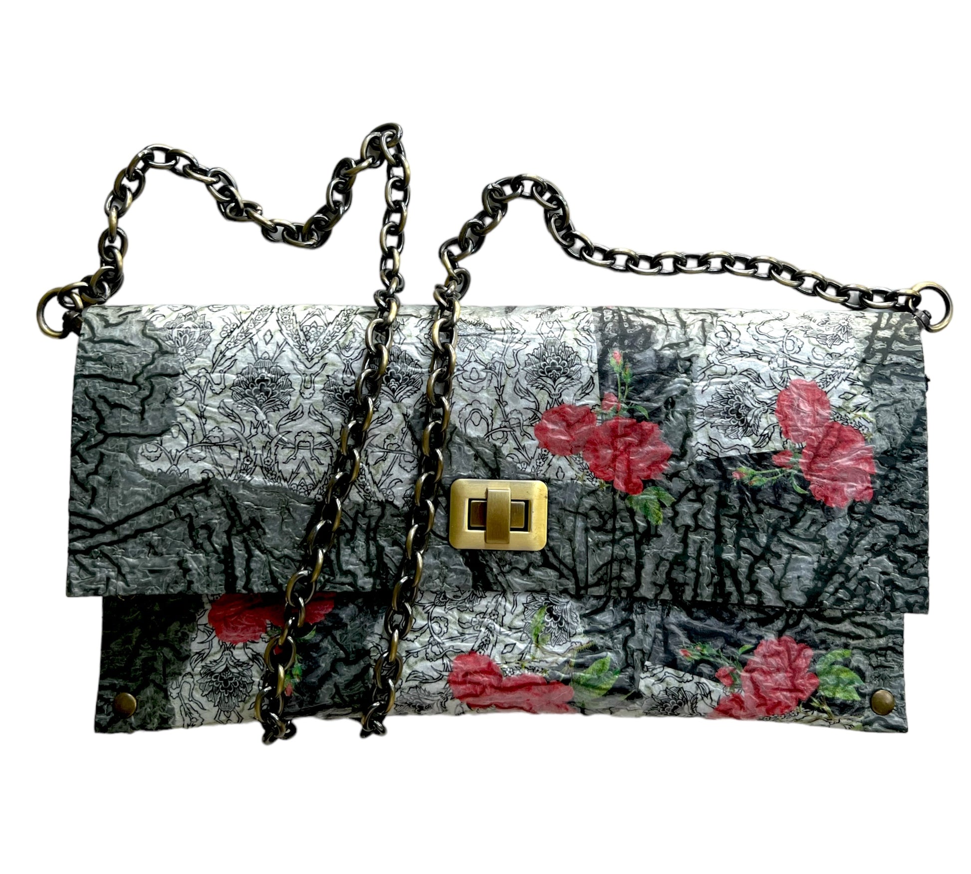 Carry your belongings in style with this unique handbag made from upcycled black plastic bags. The decoupaged roses on a white background add a touch of charm, and the crossbody design keeps your hands free. Plus, by purchasing this eco-friendly bag, you're helping reduce waste and protect the environment. (Mother Nature would approve!)"