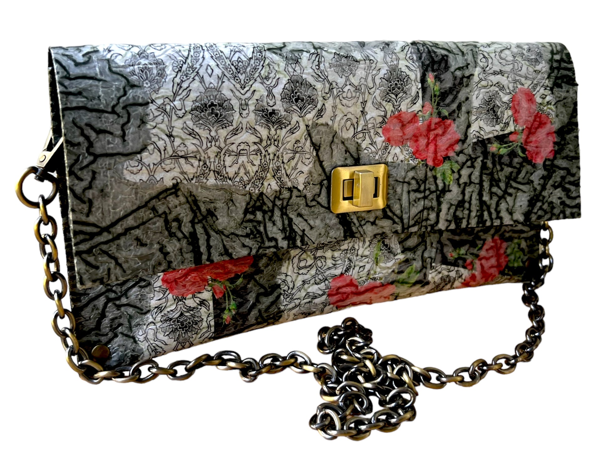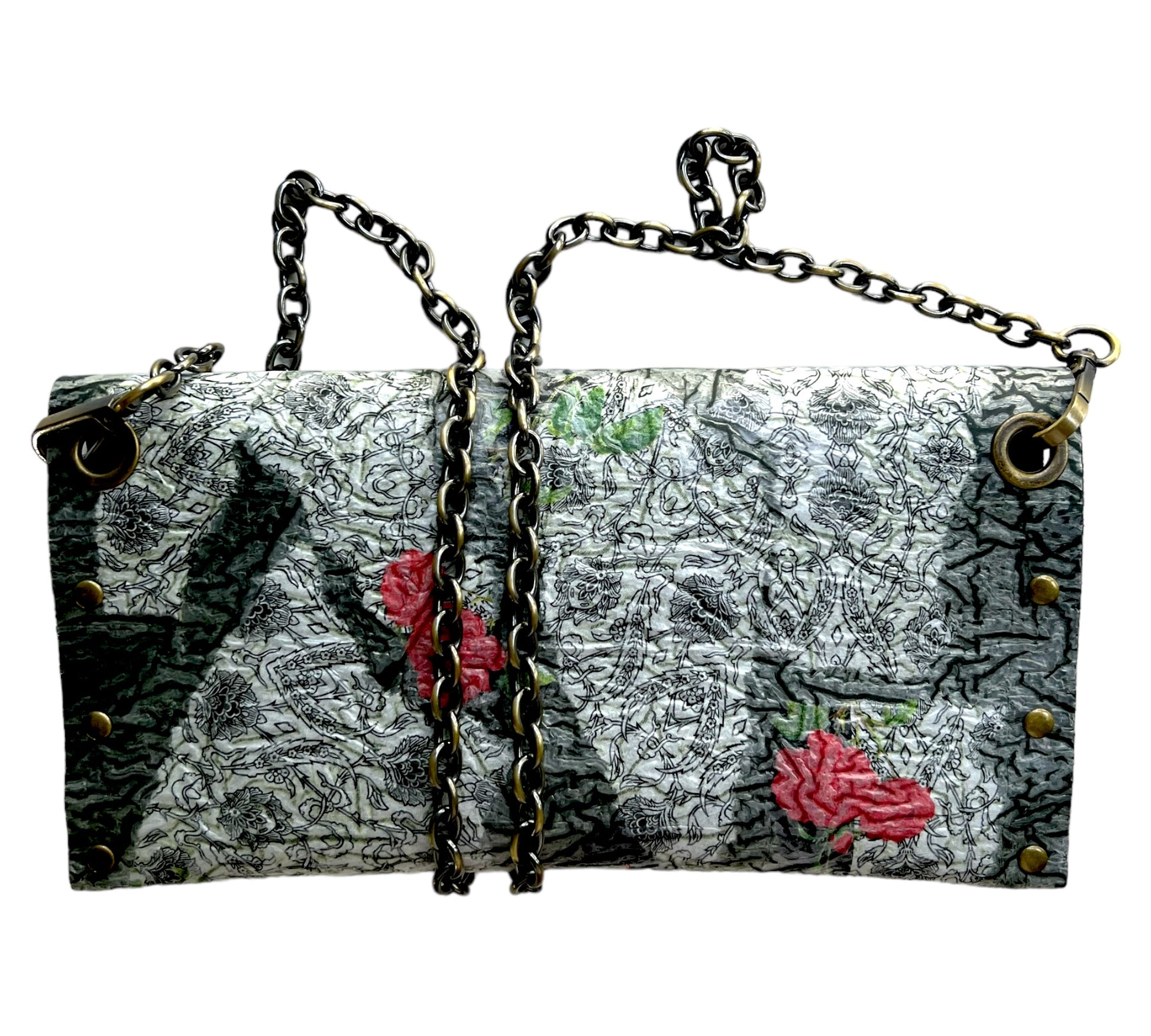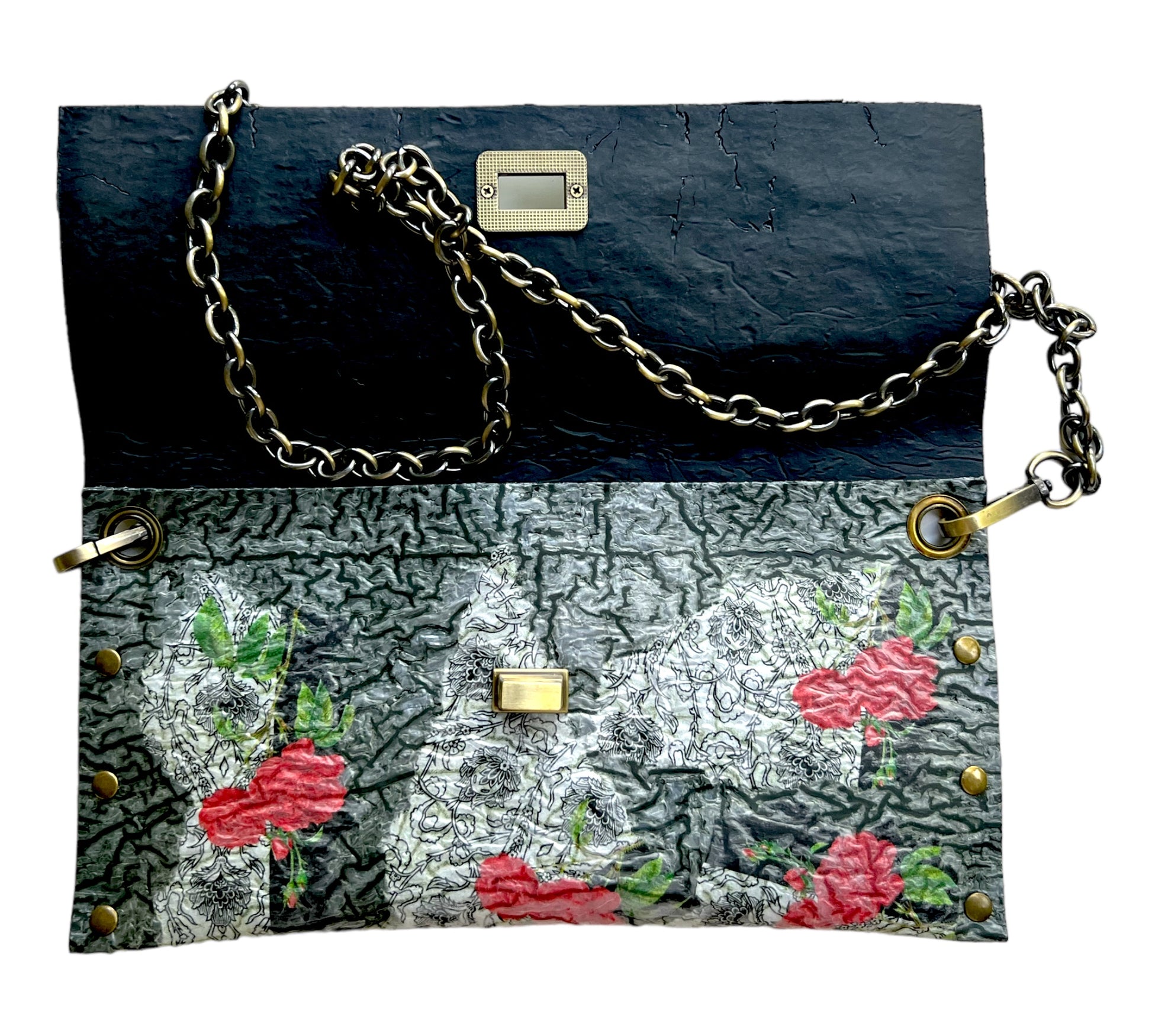 Carry your belongings in style with this unique handbag made from upcycled black plastic bags. The decoupaged roses on a white background add a touch of charm, and the crossbody design keeps your hands free. Plus, by purchasing this eco-friendly bag, you're helping reduce waste and protect the environment. (Mother Nature would approve!)"