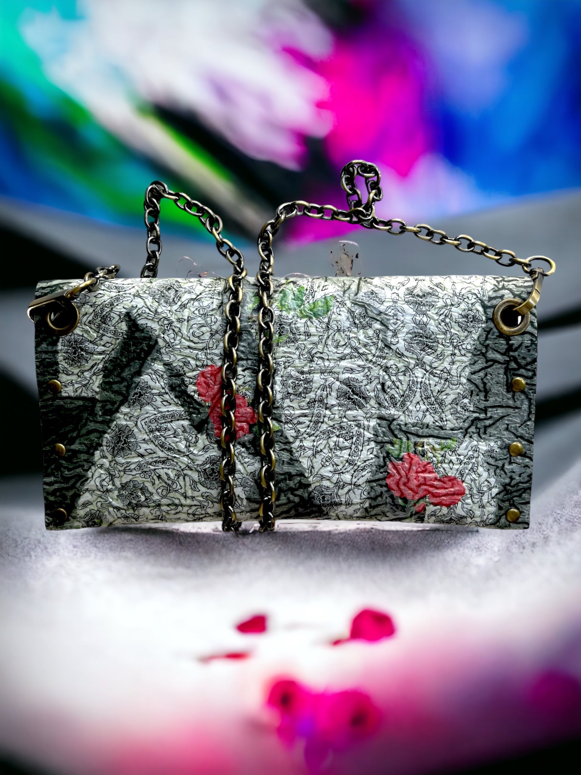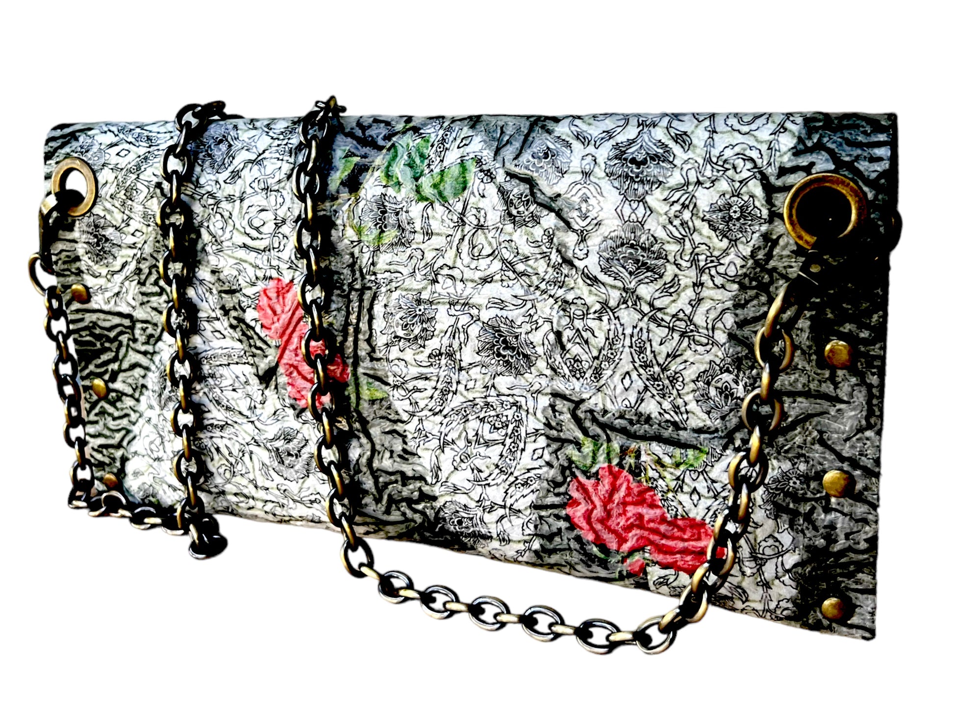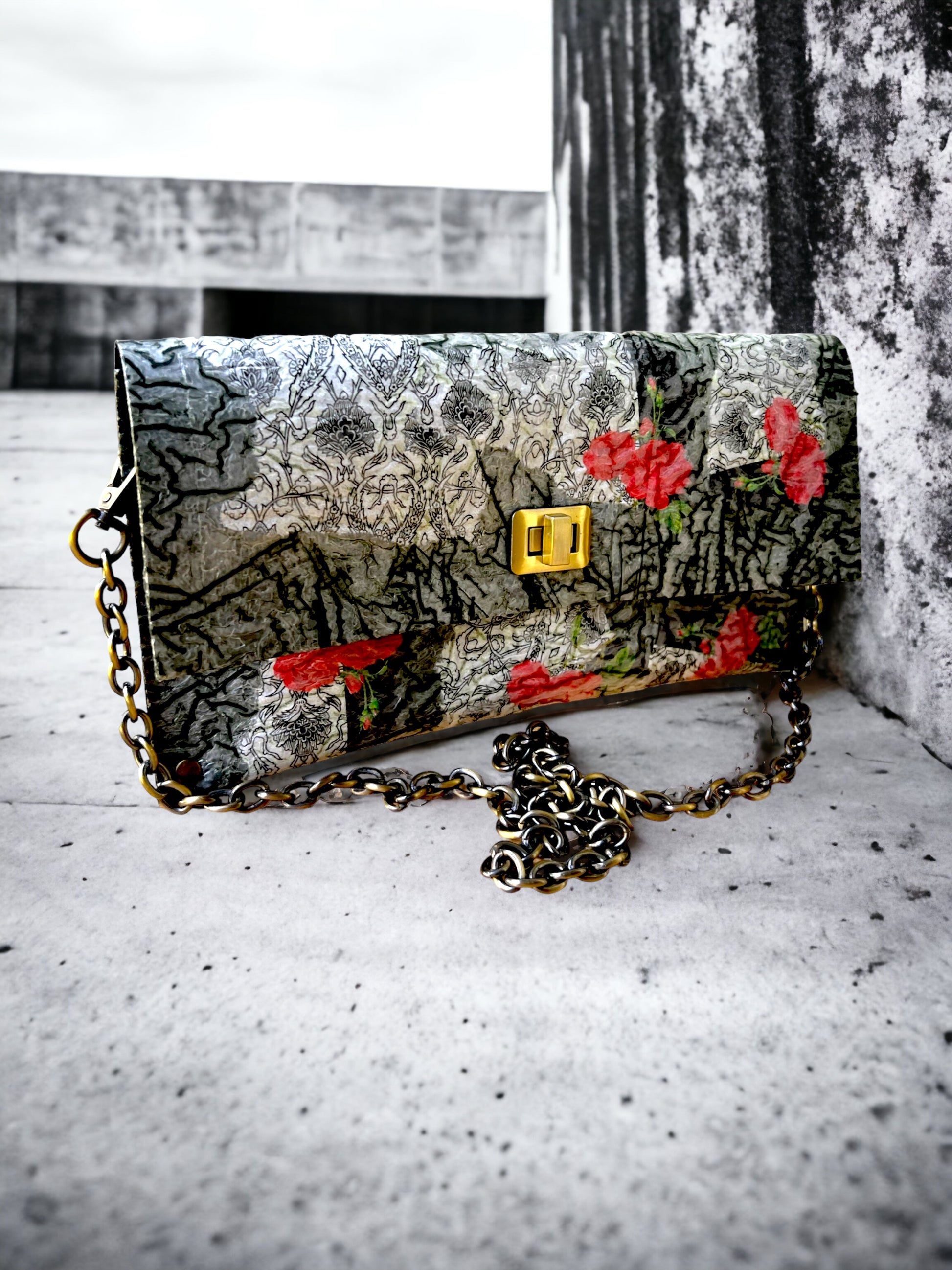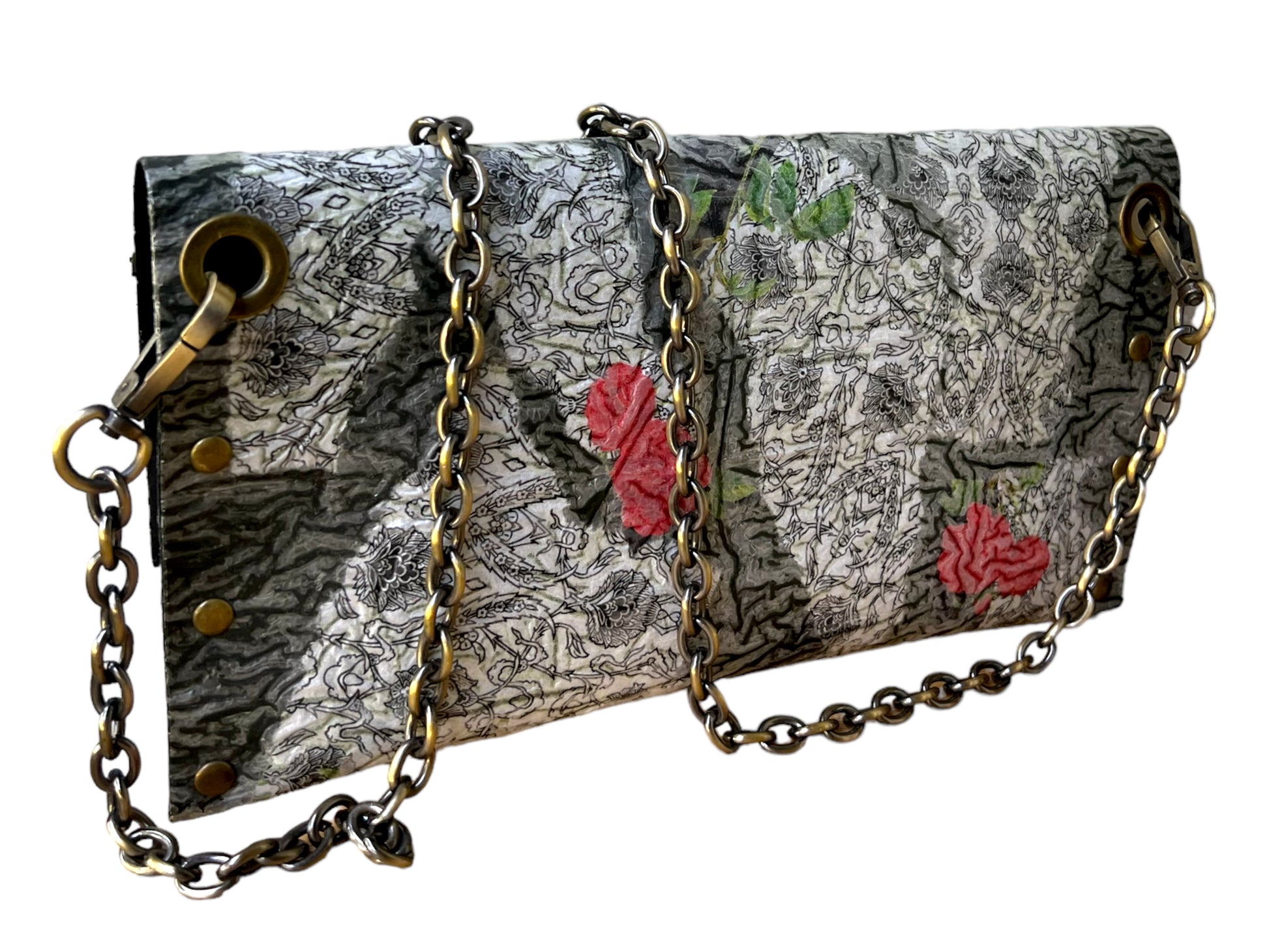 Carry your belongings in style with this unique handbag made from upcycled black plastic bags. The decoupaged roses on a white background add a touch of charm, and the crossbody design keeps your hands free. Plus, by purchasing this eco-friendly bag, you're helping reduce waste and protect the environment. (Mother Nature would approve!)"