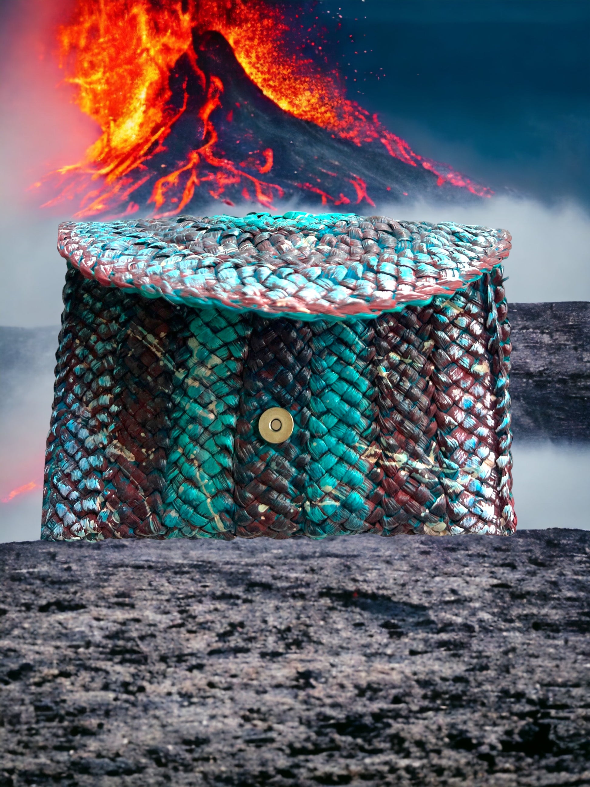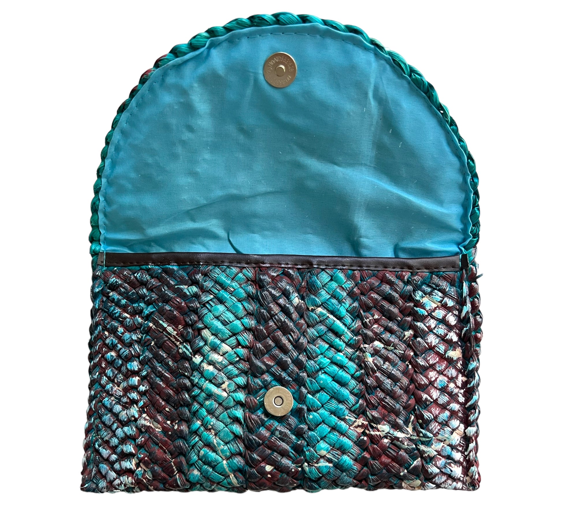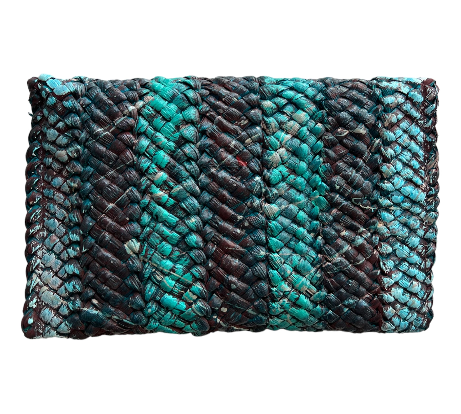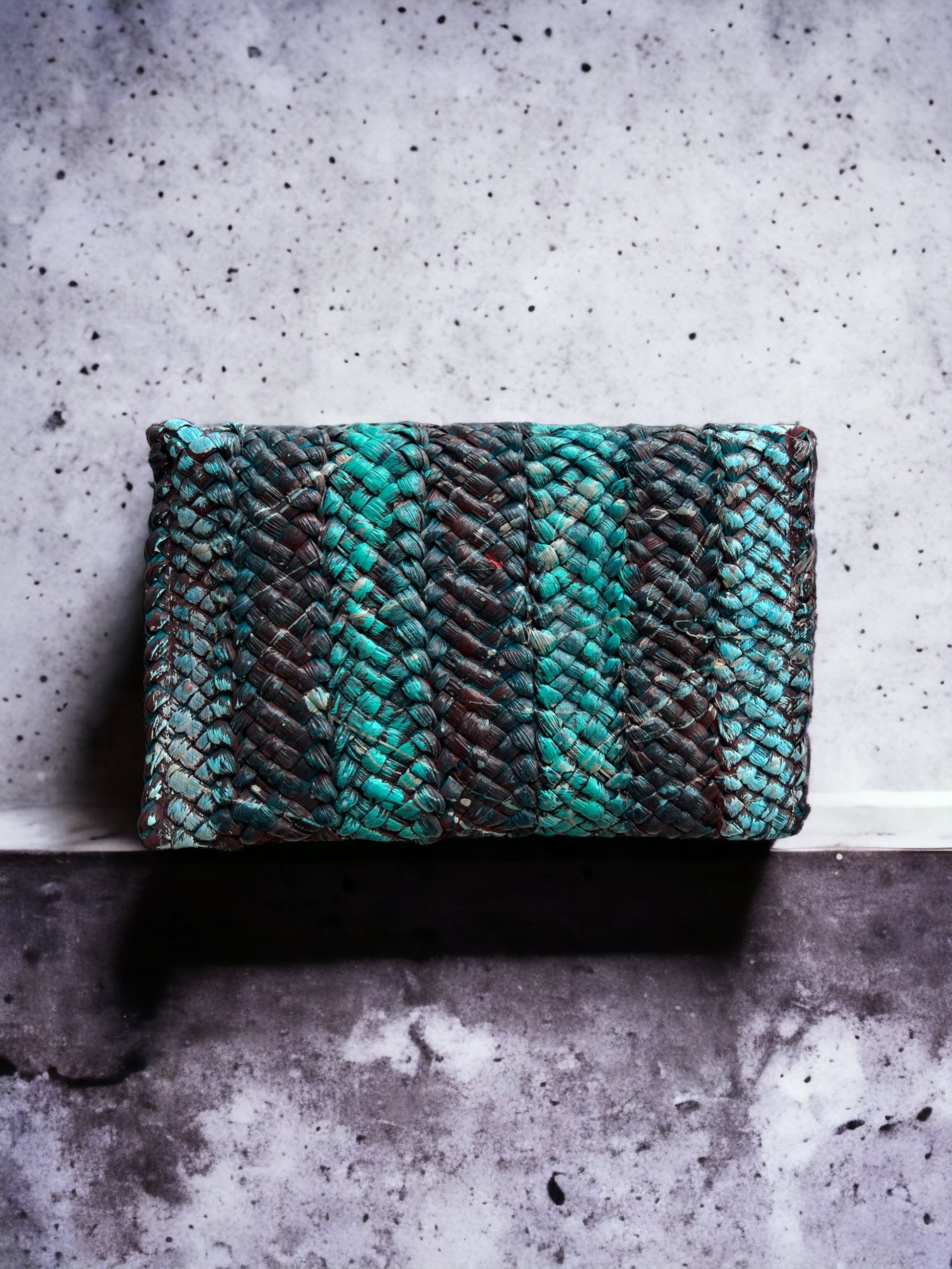 This stunning handbag boasts a gorgeous turquoise straw design, meticulously crafted into an elegant clutch envelope. The perfect accessory for any occasion, it offers both style and functionality. Crafted with care, its beautiful brushstrokes create a breathtaking aesthetic that's perfect for summer. Dare to sparkle and shine with a unique piece that's truly one-of-a-kind!